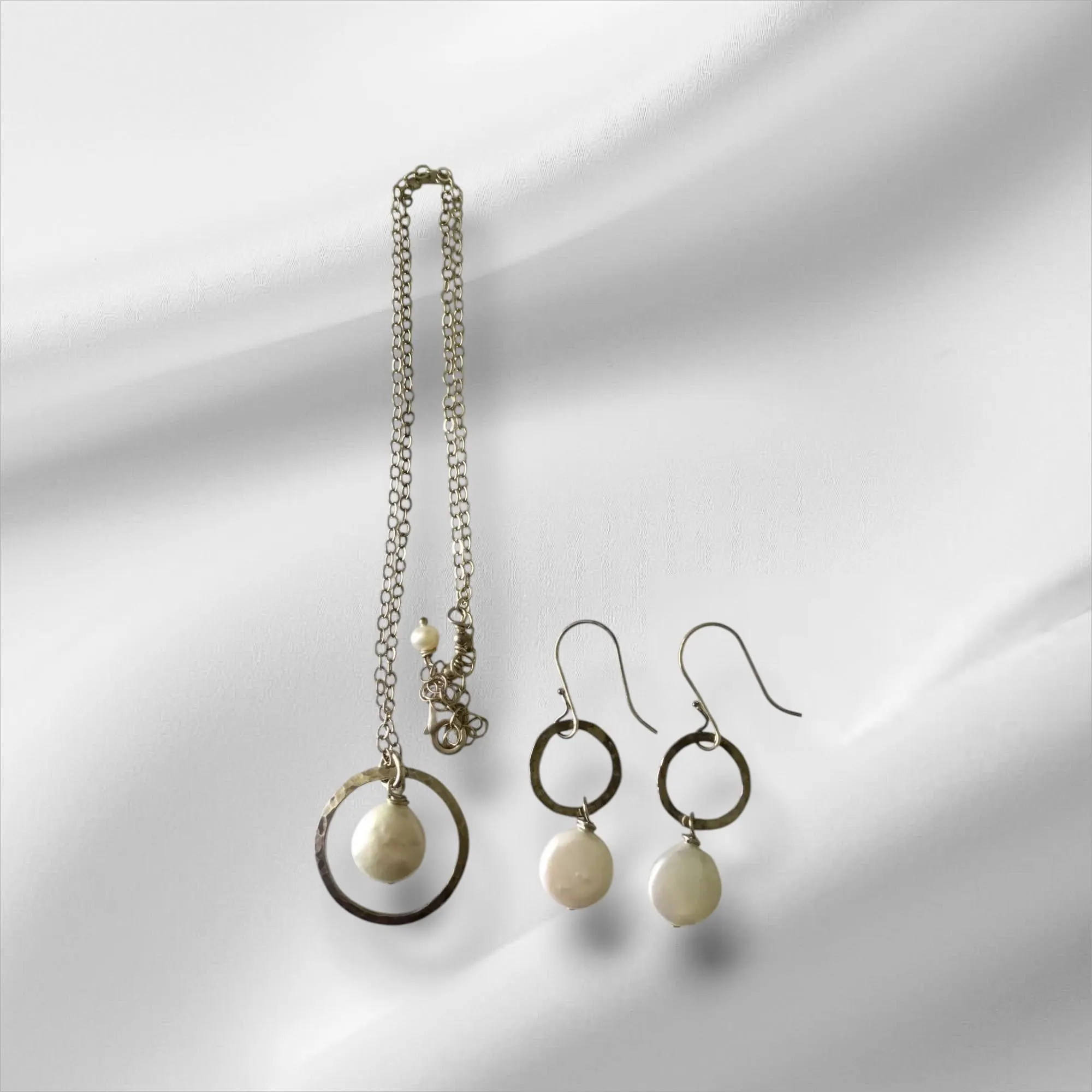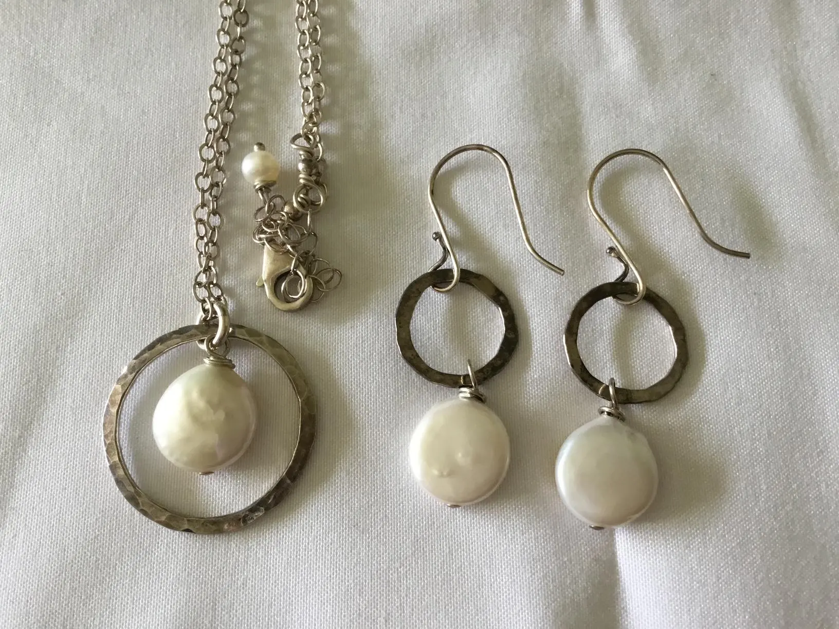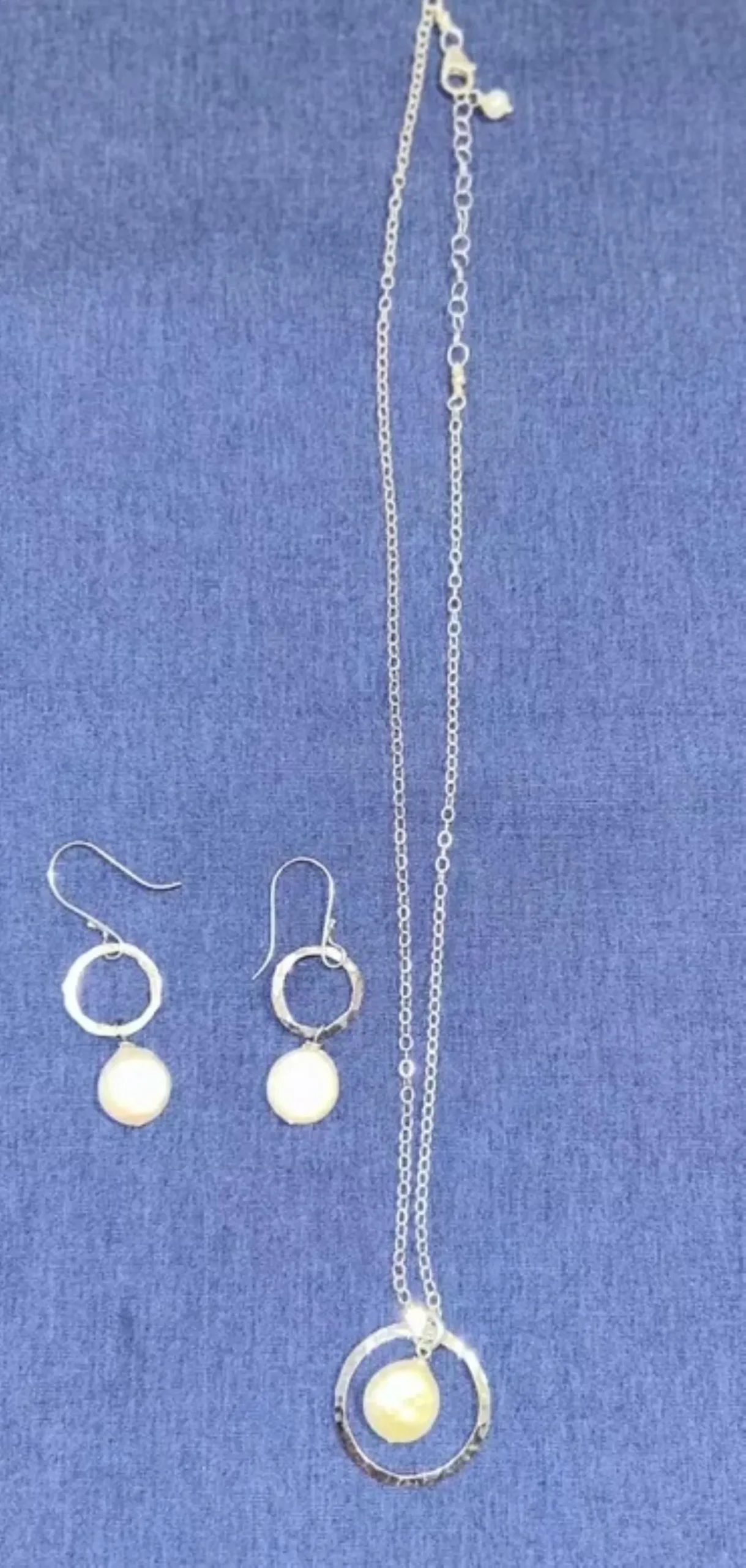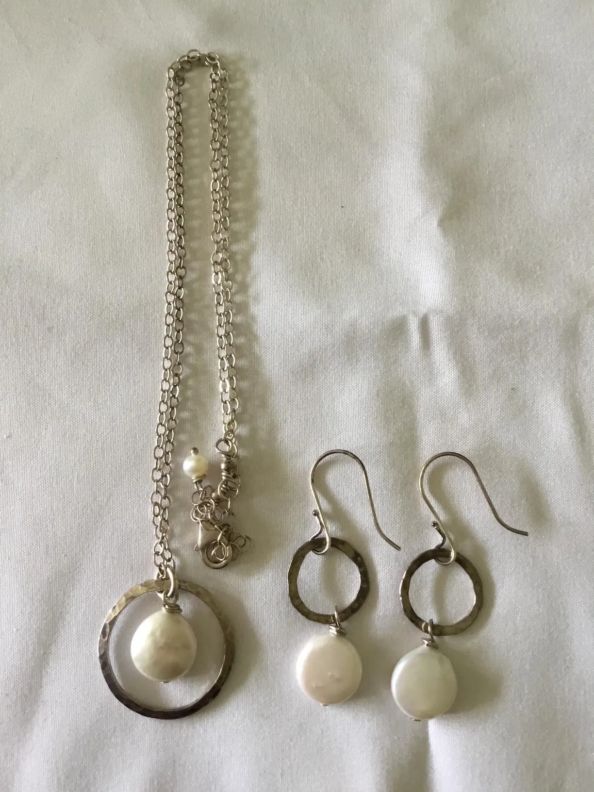 Sterling Silver And Pearl Necklace With Matching Earrings. They are in excellent condition. The earrings measure 2 by 3/4 inch. The pendant measures 1” in diameter. The chain measures 18” long but can be worn at a smaller size. Beautiful set in my opinion. This necklace & earring set is in “as found” condition and not cleaned by us, leaving the choice of cleaning or not up to its new owner.