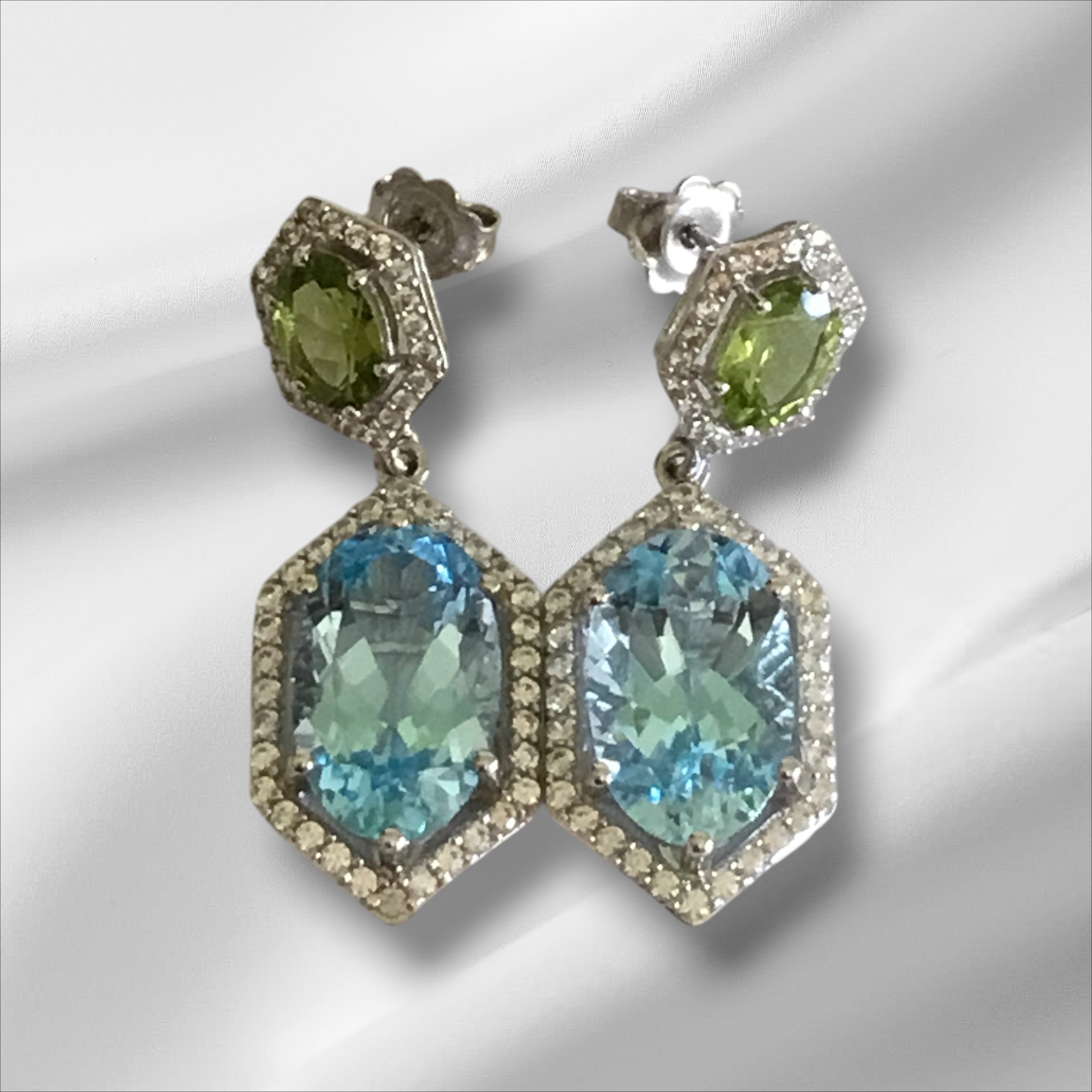 Stunning Sterling Silver Dangling Earrings w/Aqua, Light Green & CZ Stones