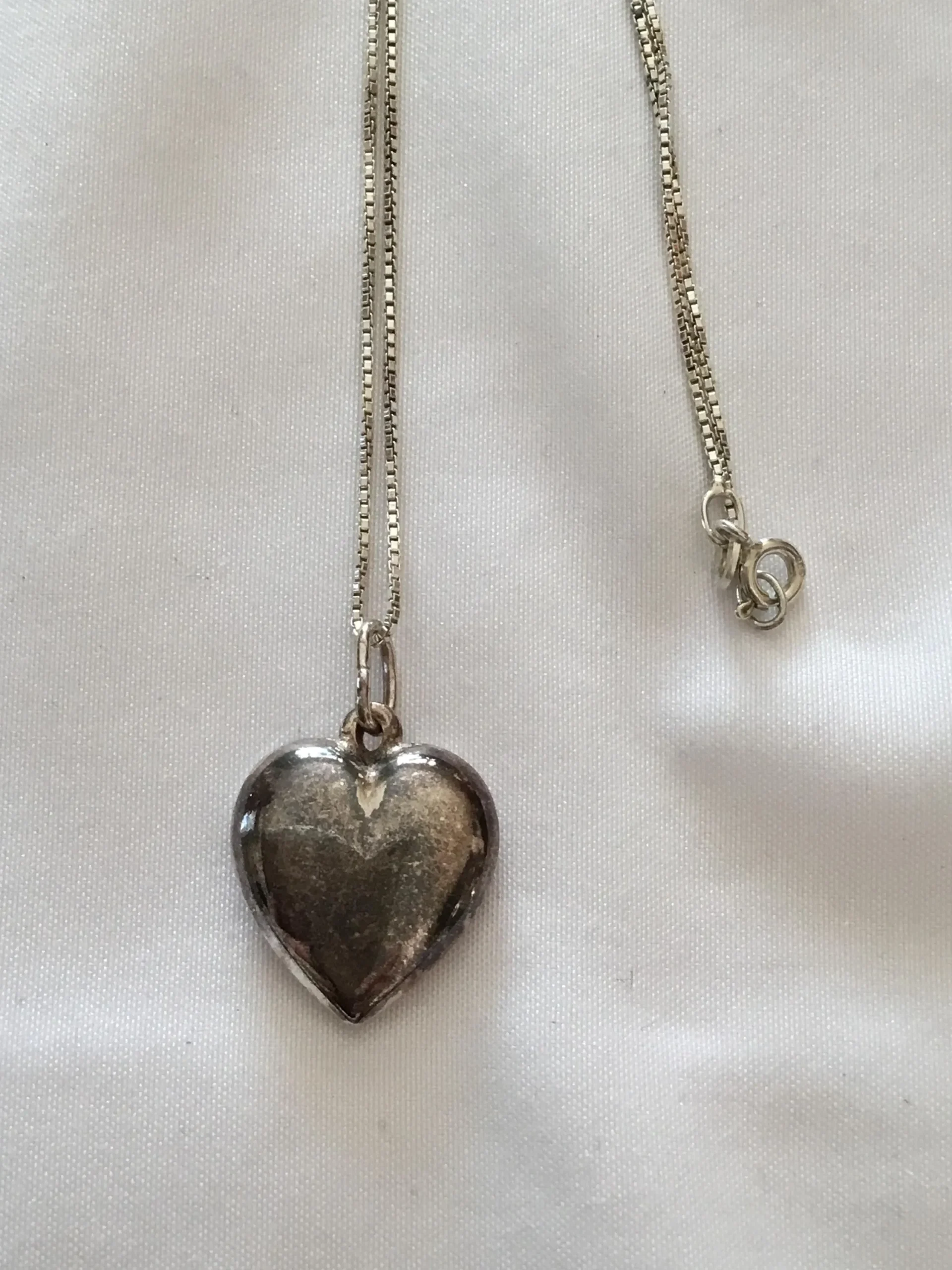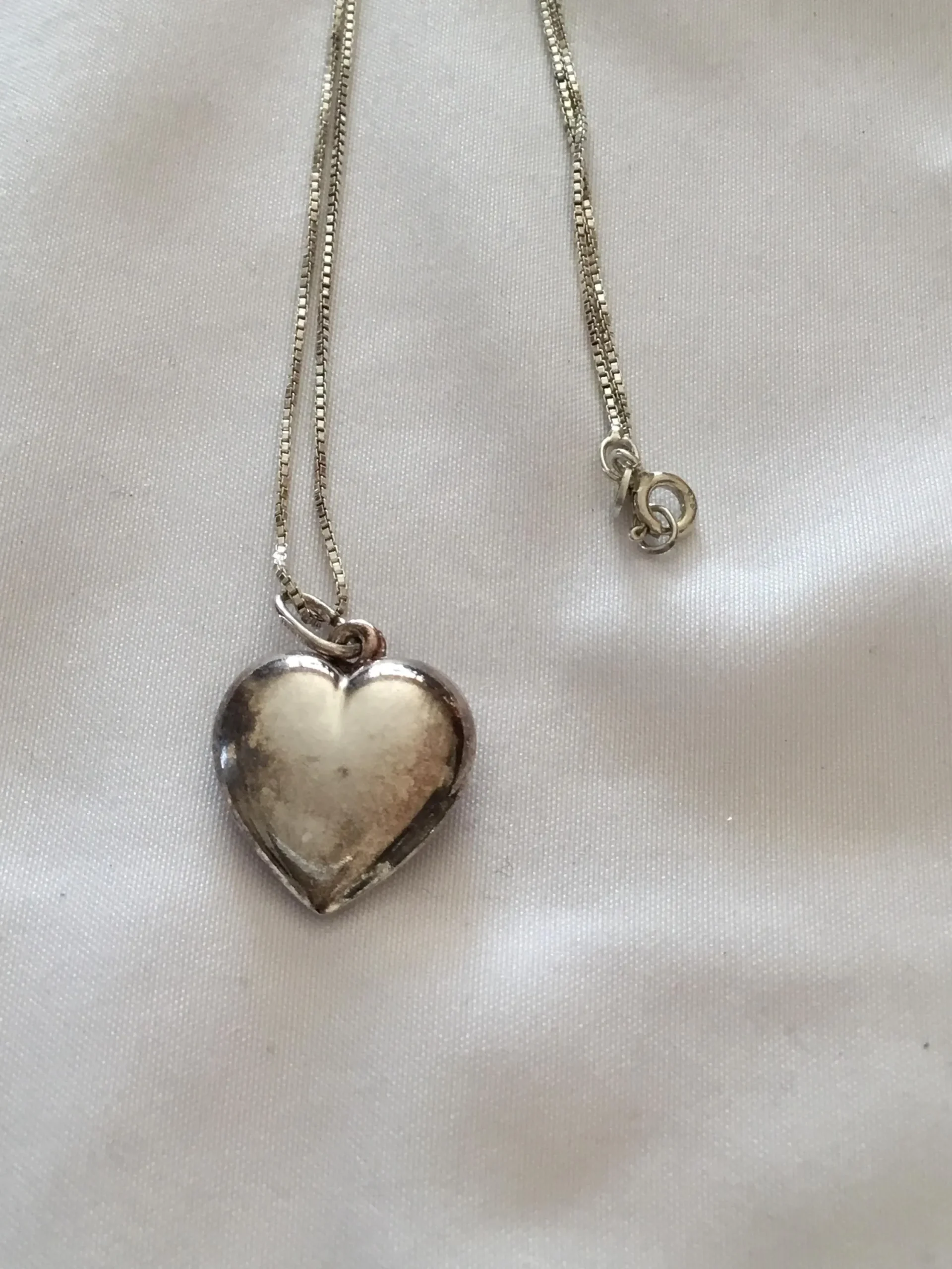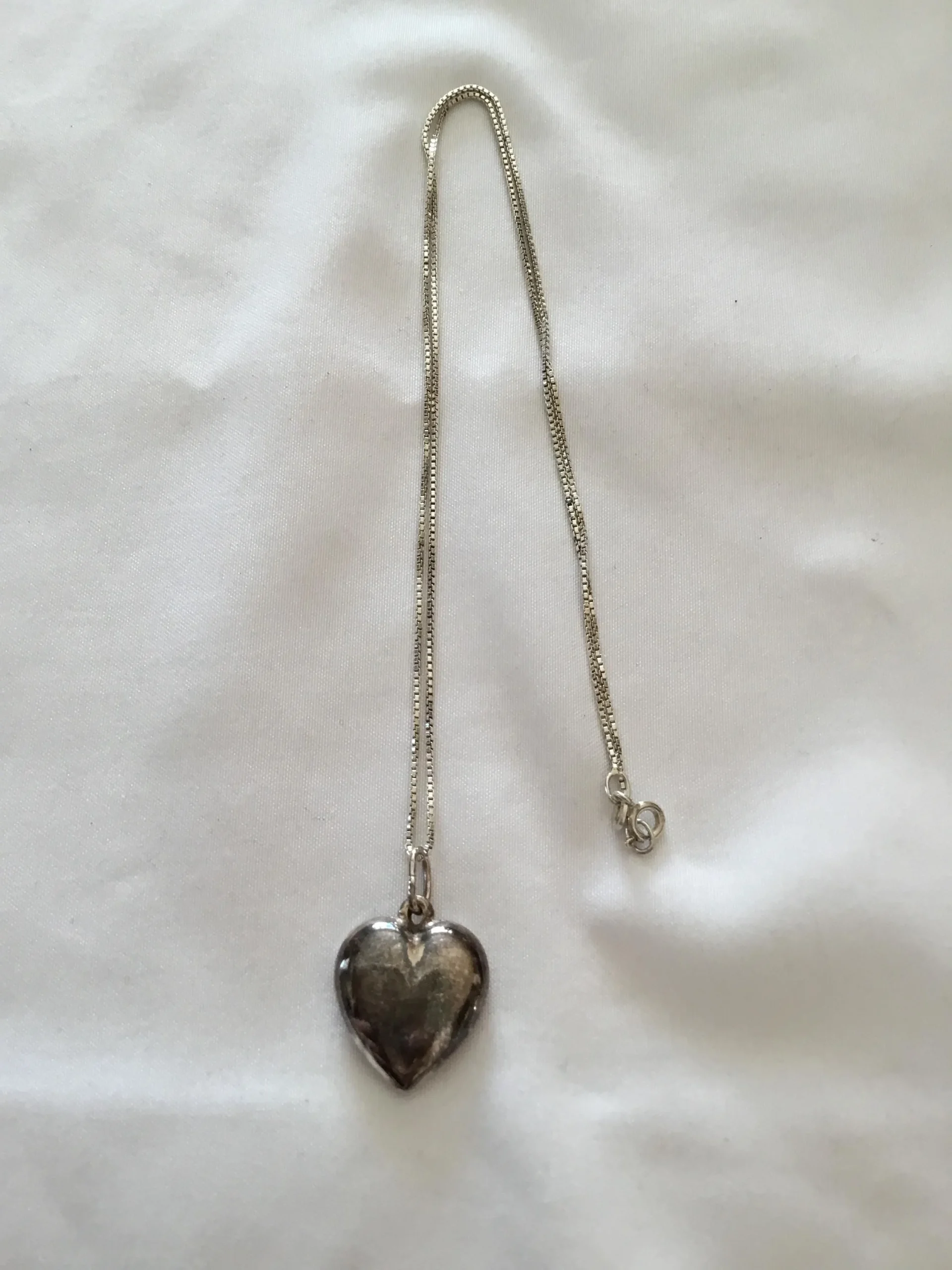 Sterling Silver Heart Pendant Necklace, 18”. Heart is marked Sterling and measures approximately 1/2” and the necklace is marked 925. Please view the images for condition and details and grade by your own grading standards.