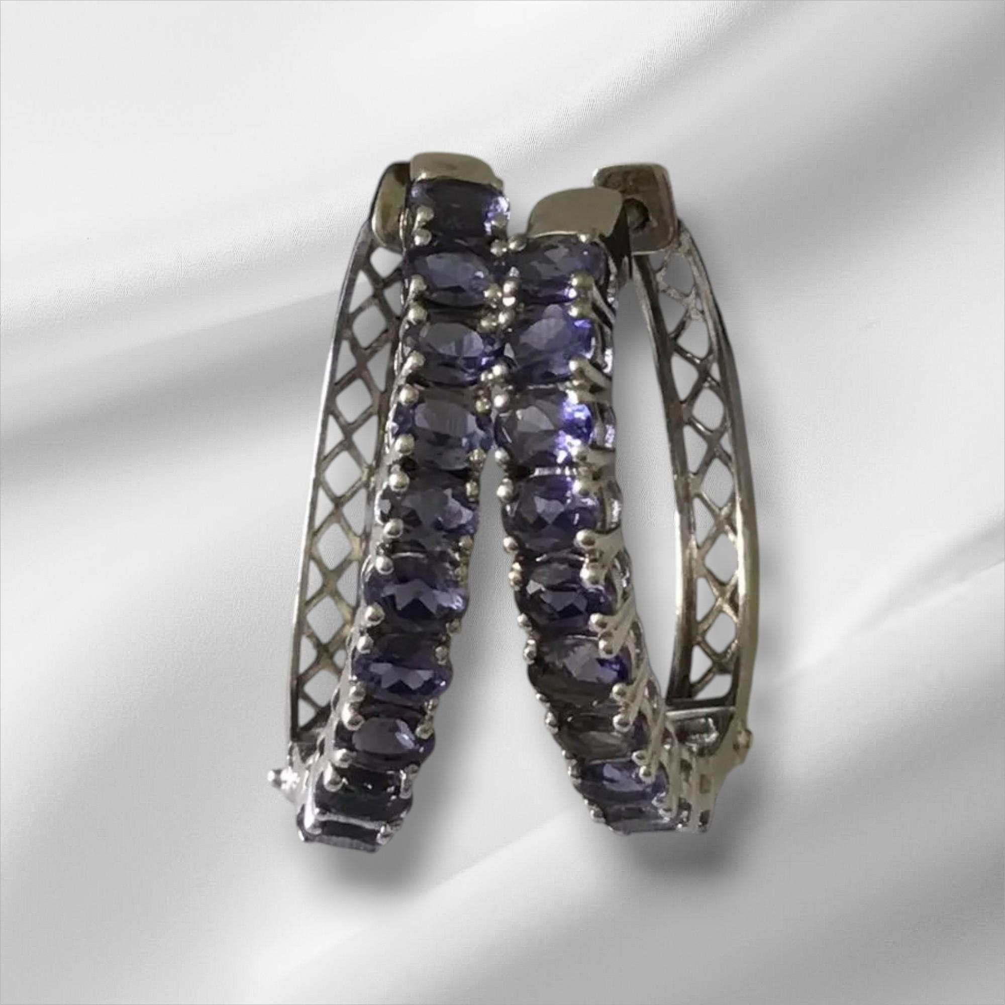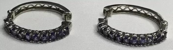 Sterling Silver Hoop Earrings For Pierced Ears W/10 Light Purple Stones In Each One