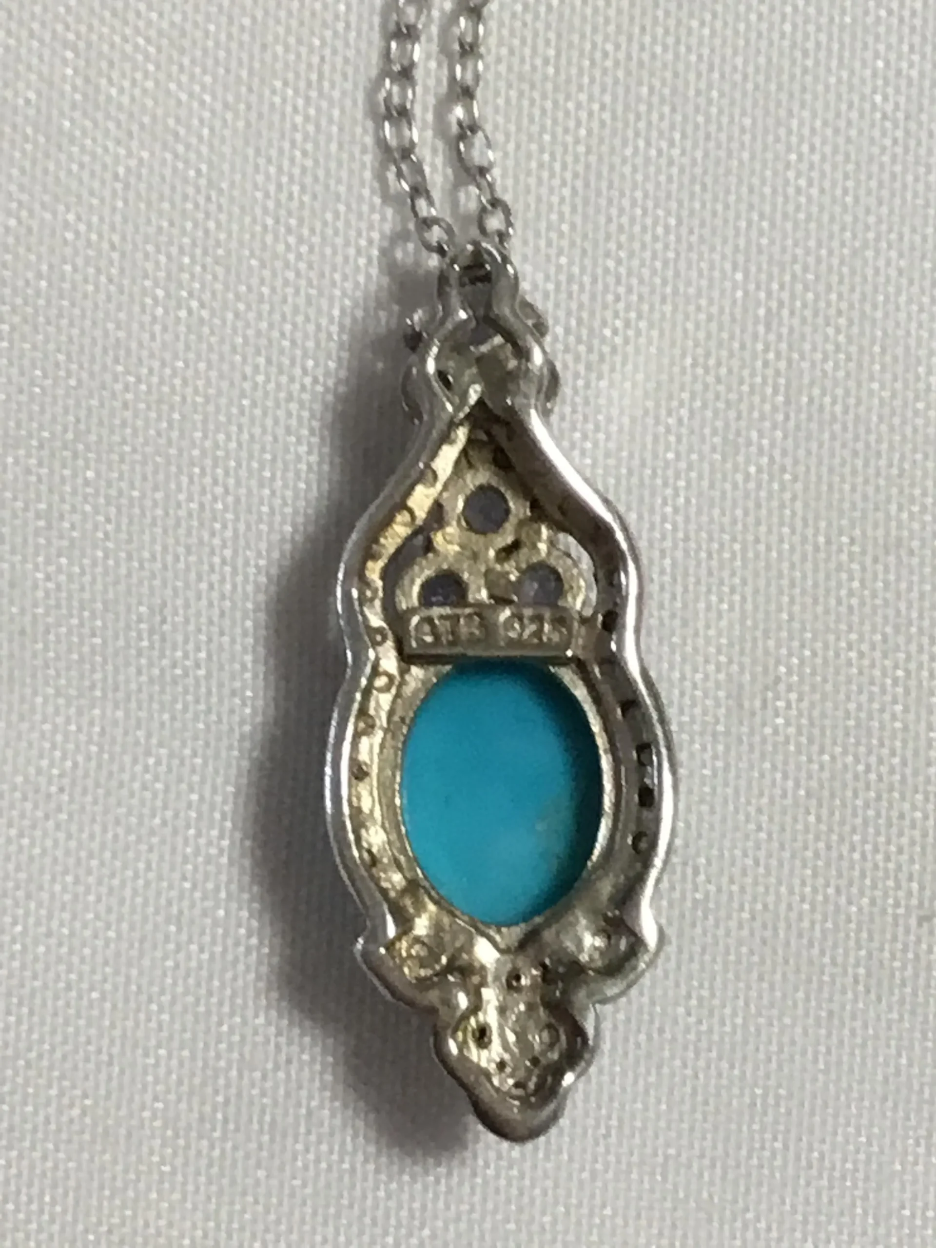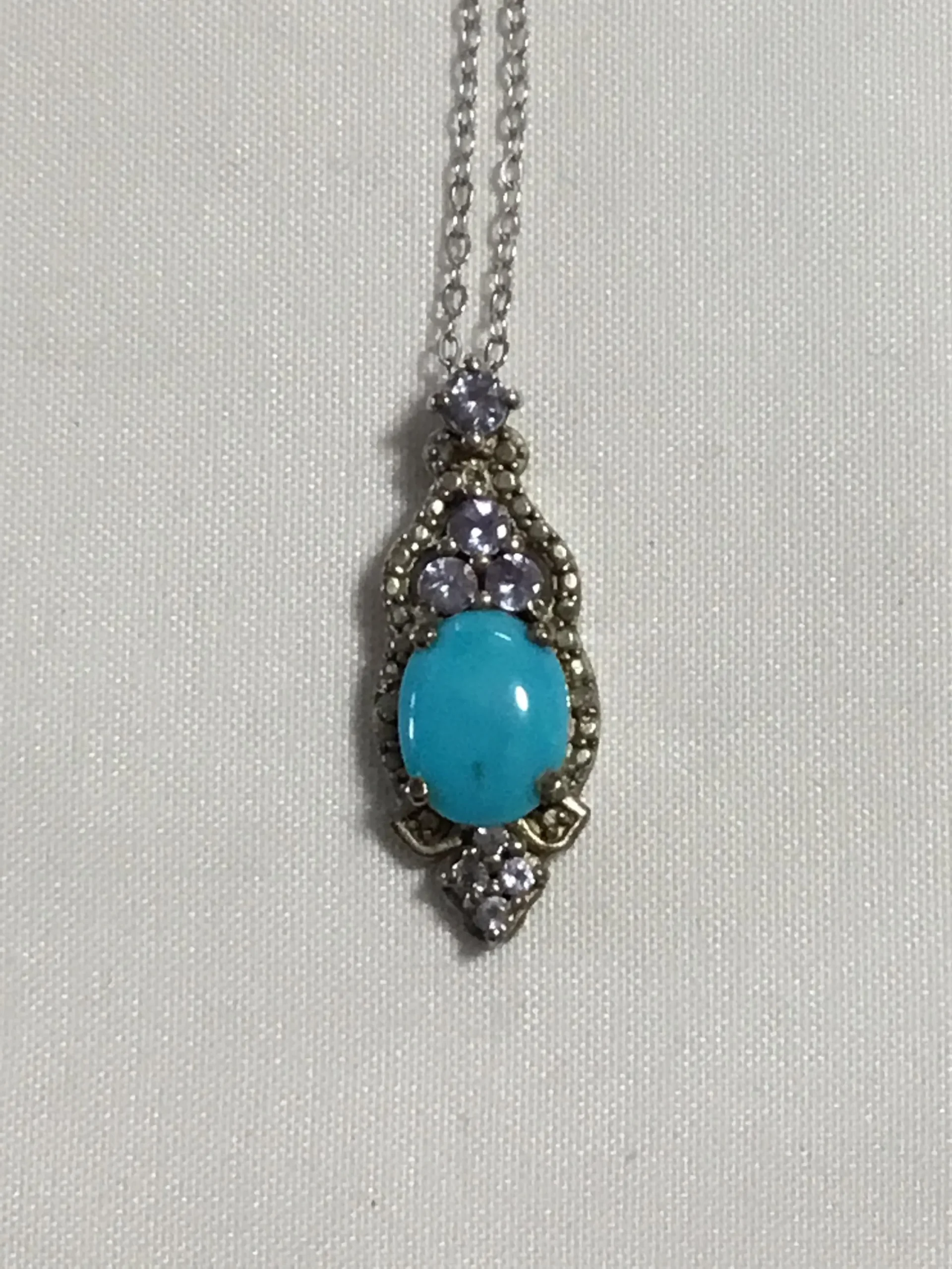 Sterling Silver Necklace w/Turquoise and Purple Stones 20″. Beautiful necklace in my opinion. Marked 925. Please view images for condition and details and grade by your own grading standards.