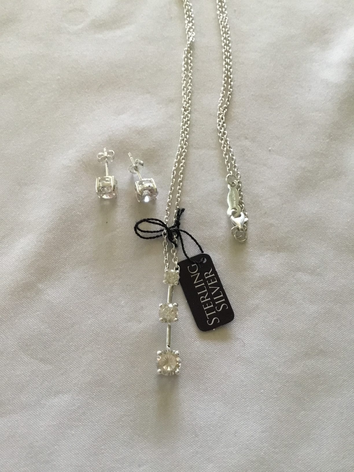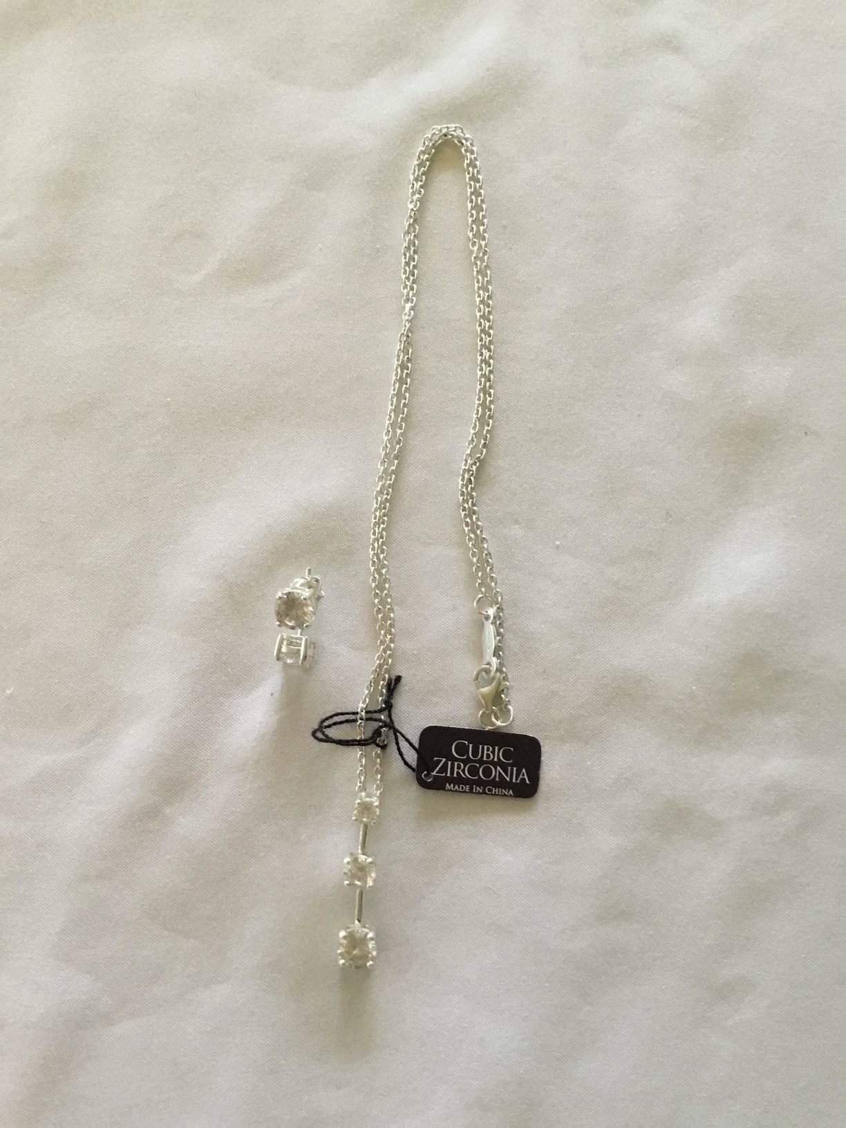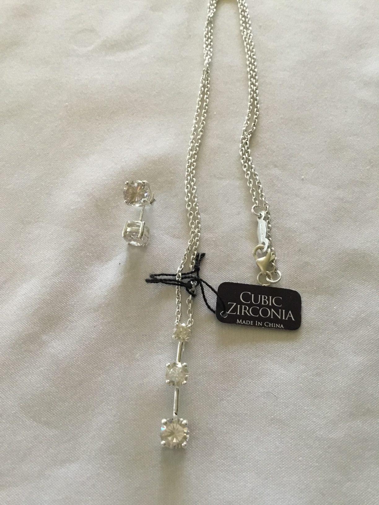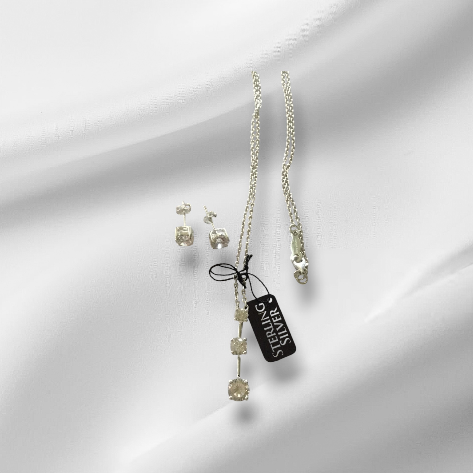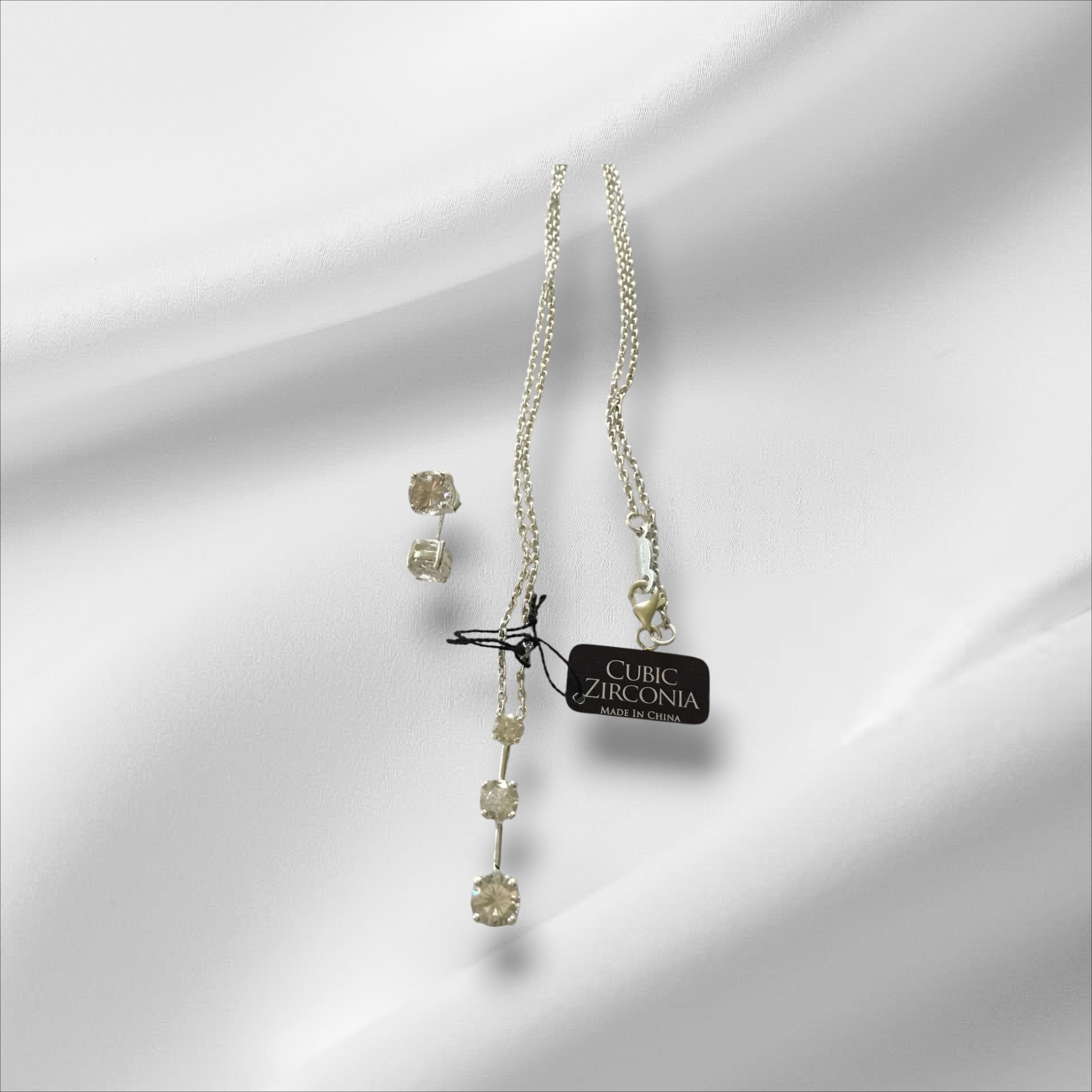 Sterling Silver Past, Present And Future CZ Pendant With CZ Stud Earrings. This necklace & earring set are in “as found” condition and not cleaned by us, leaving the choice of cleaning or not up to its new owner. Please view images for condition and details and grade by your own grading standards.