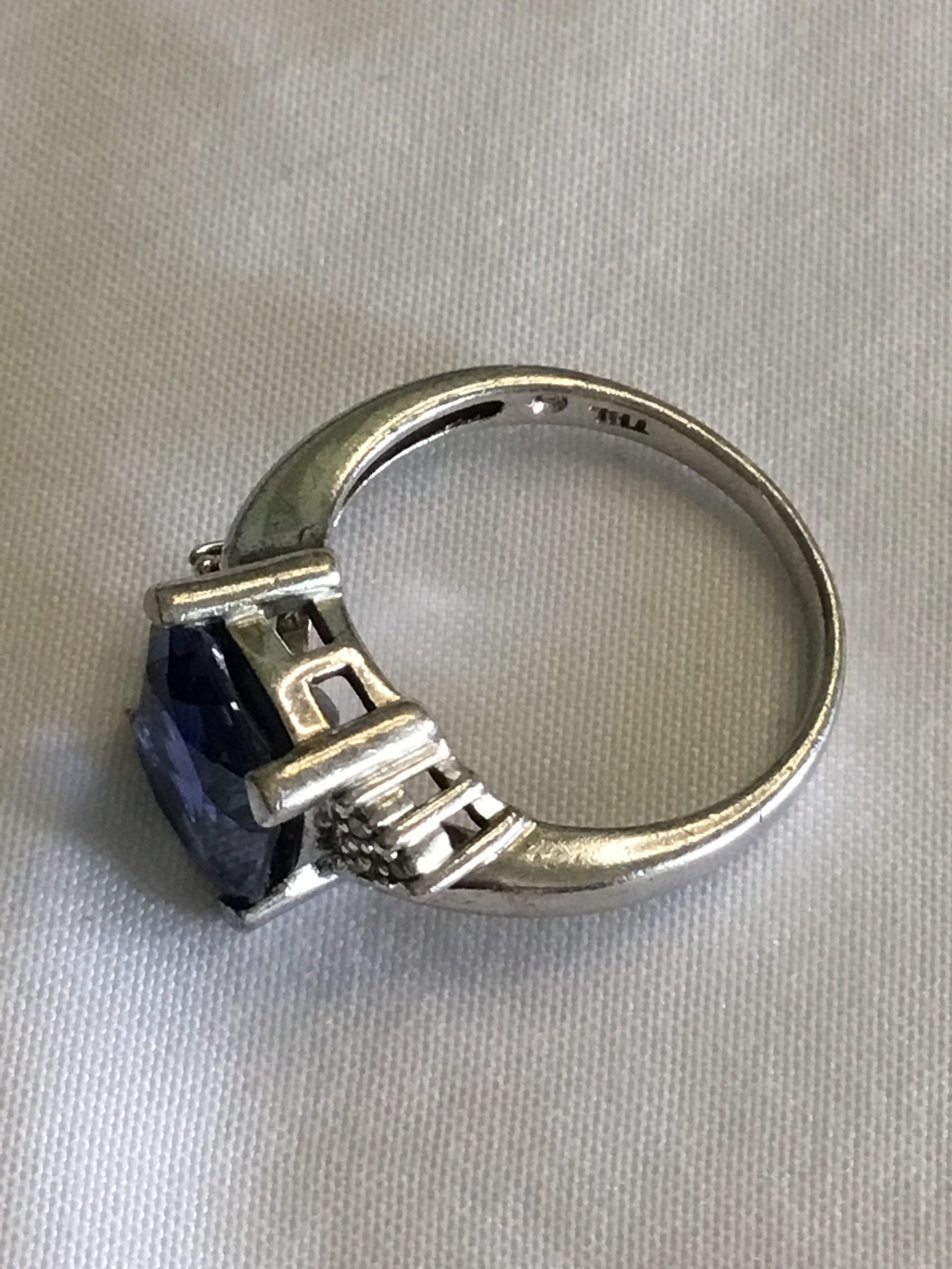 Sterling Silver Ring w/Blue Stone, Size 7. Marked 925. The ring has a blue stone, CZ stones and marcasite. The ring is in “as found” condition and not cleaned by us, leaving the choice of cleaning or not up to its new owner. Please view images for condition and details and grade by your own grading standards. Great gift item.