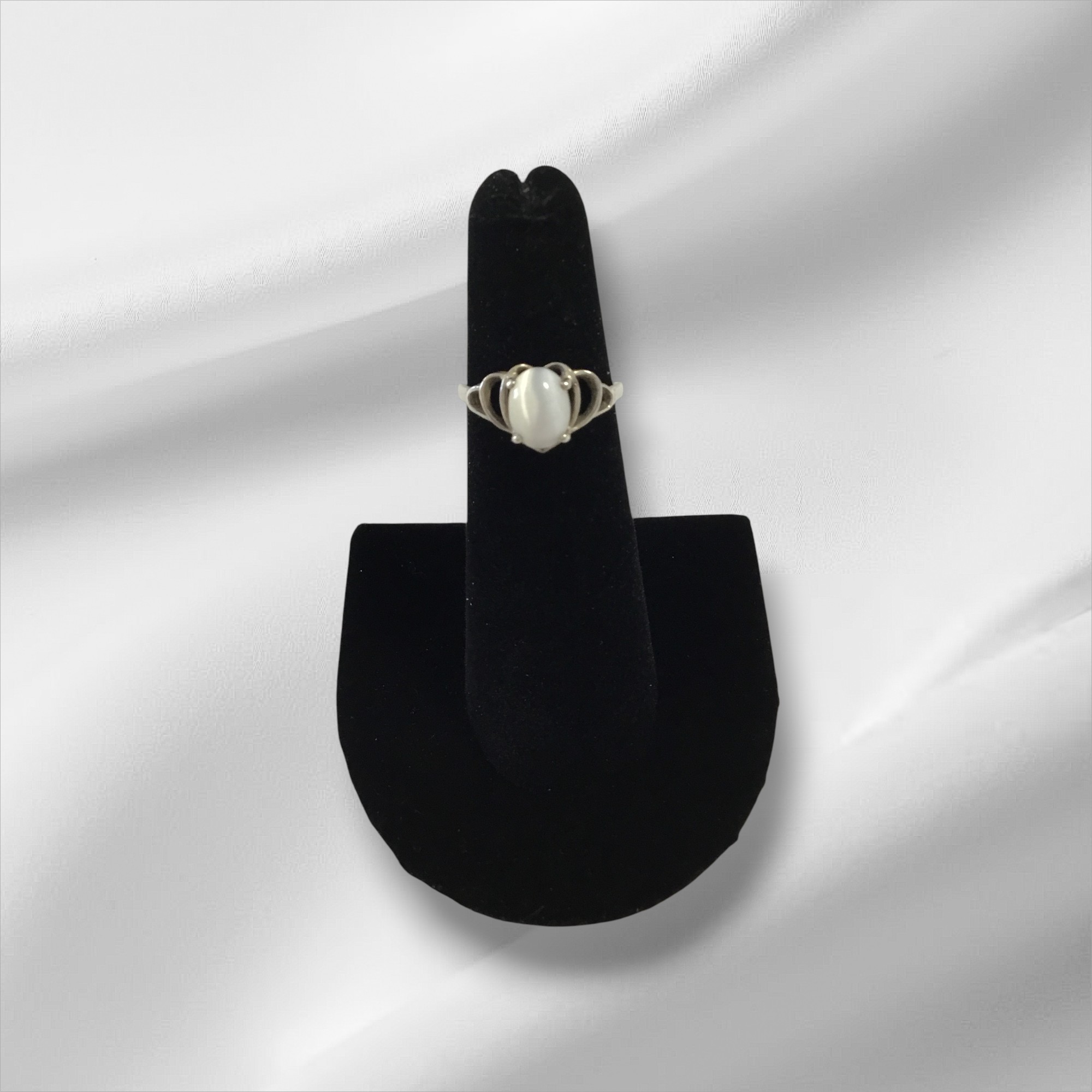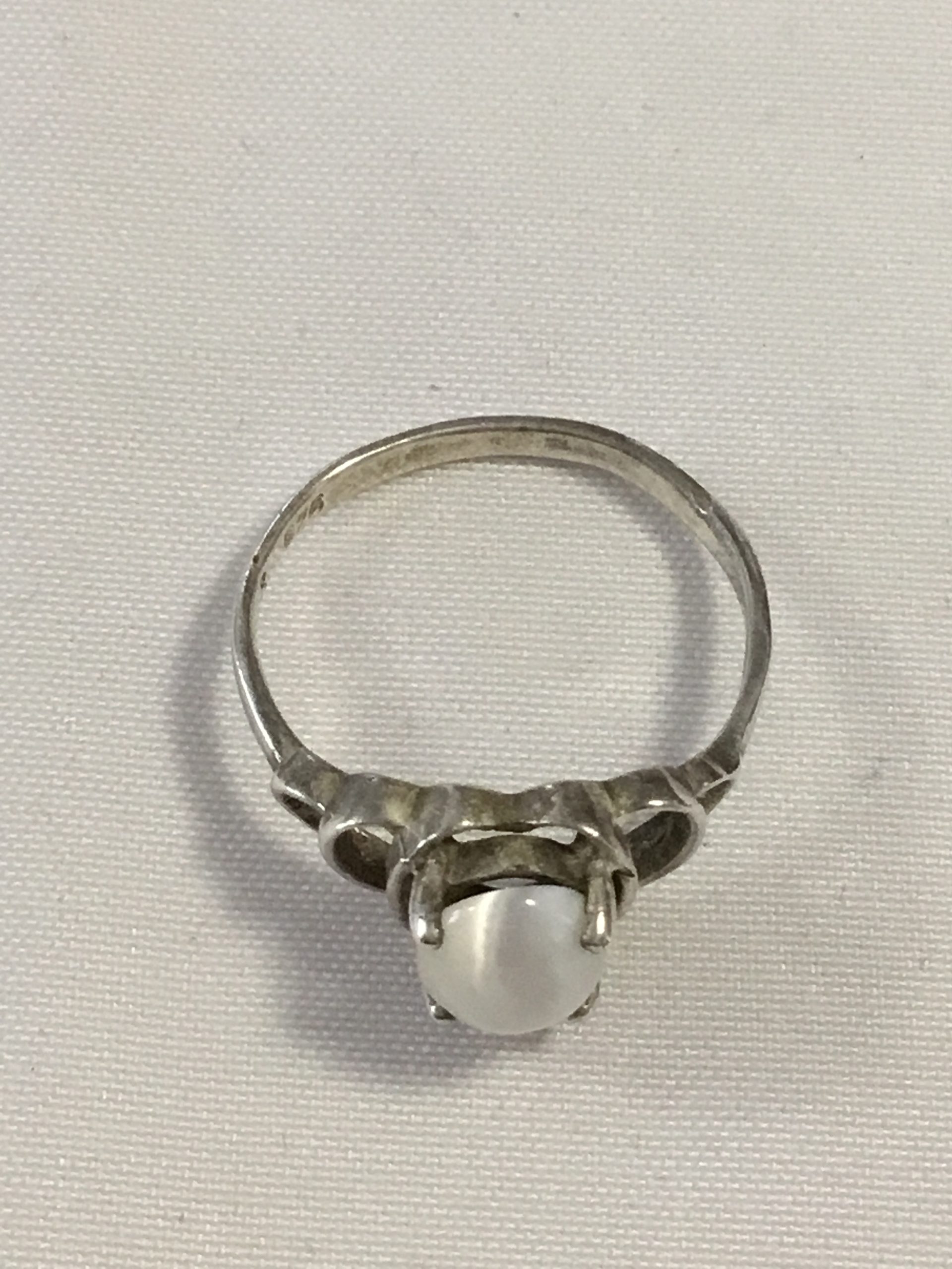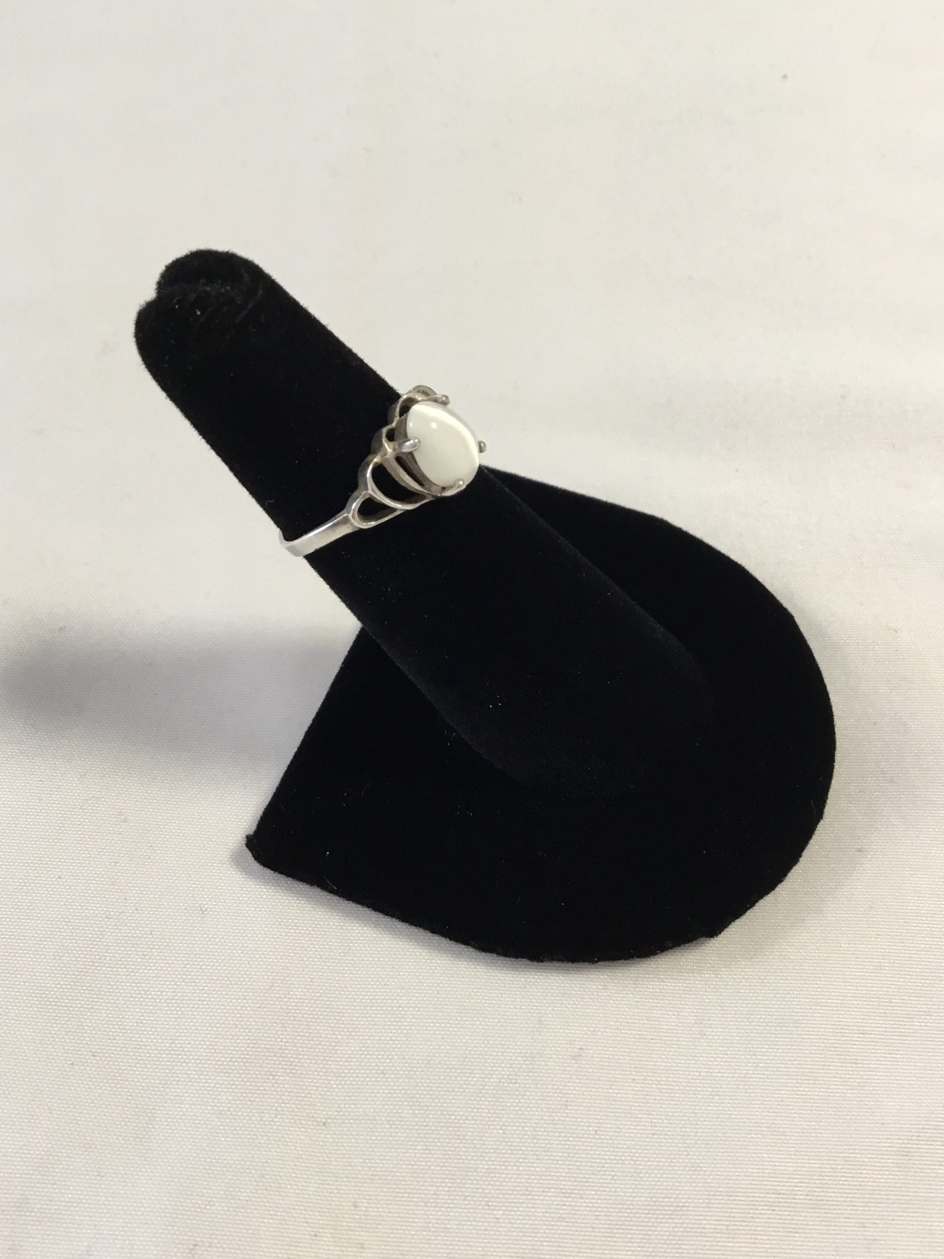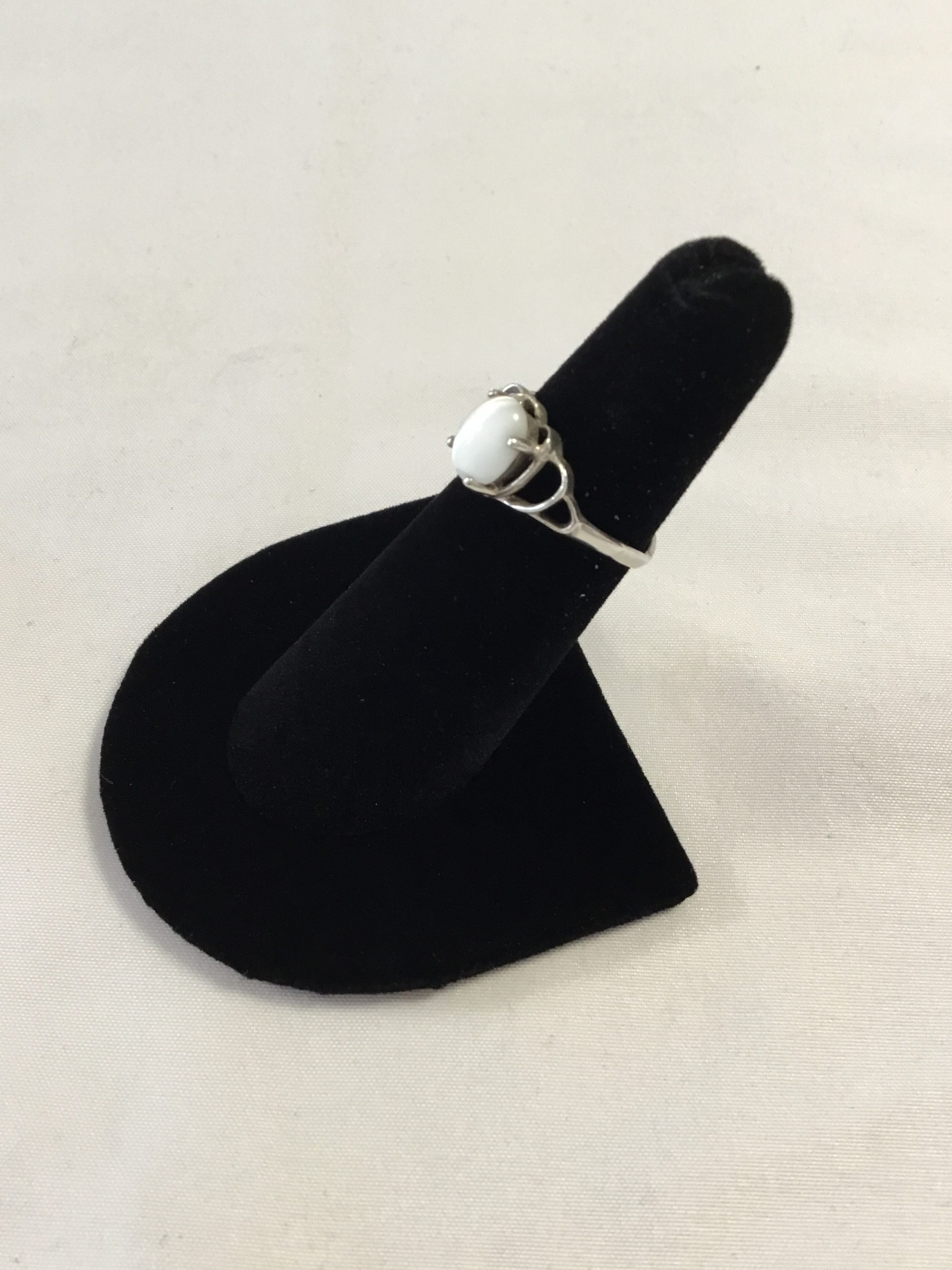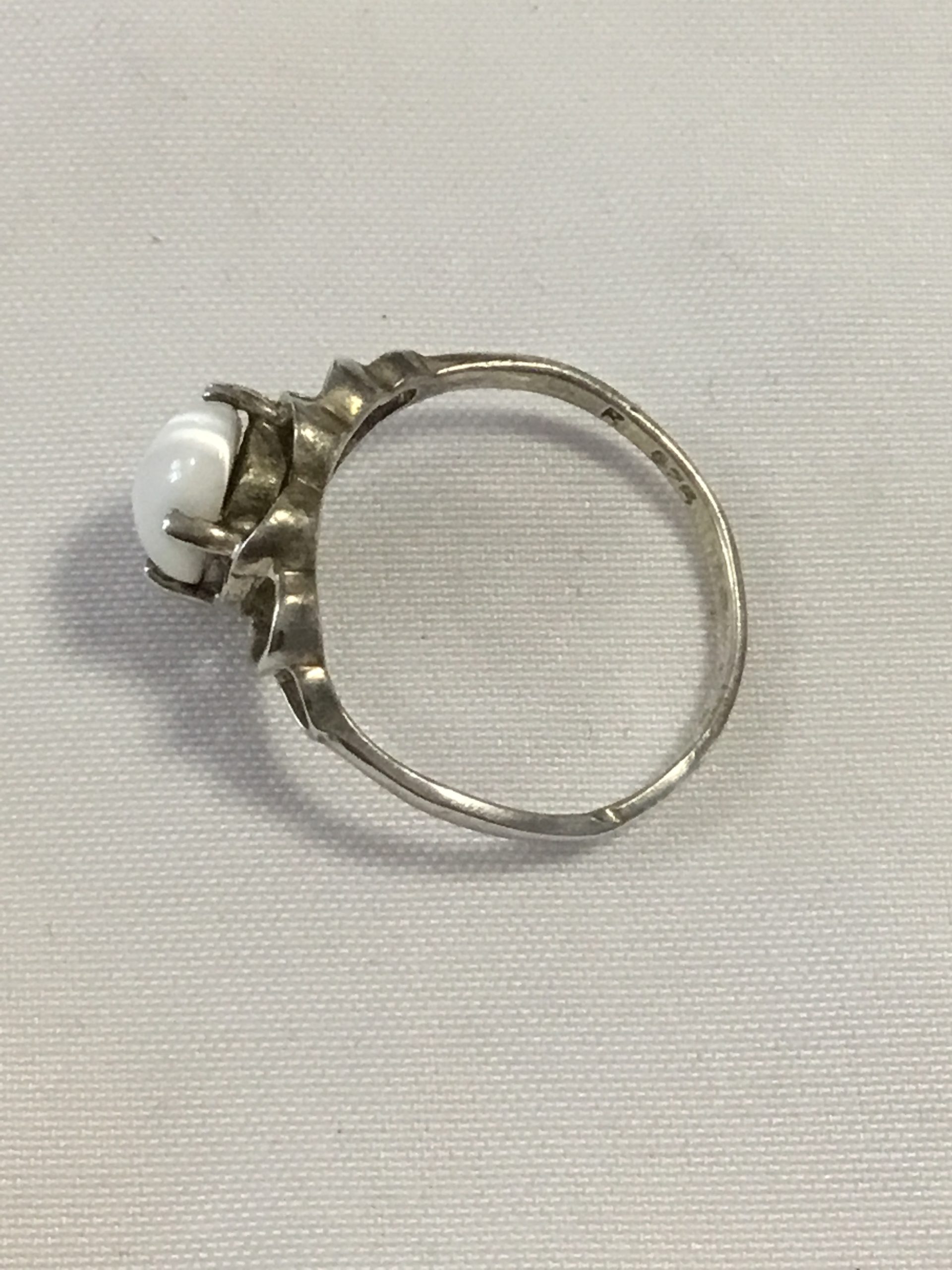 Sterling Silver Ring w/White Stone, Size 5. Marked 925. Please view images for condition and details and grade by your own grading standards.