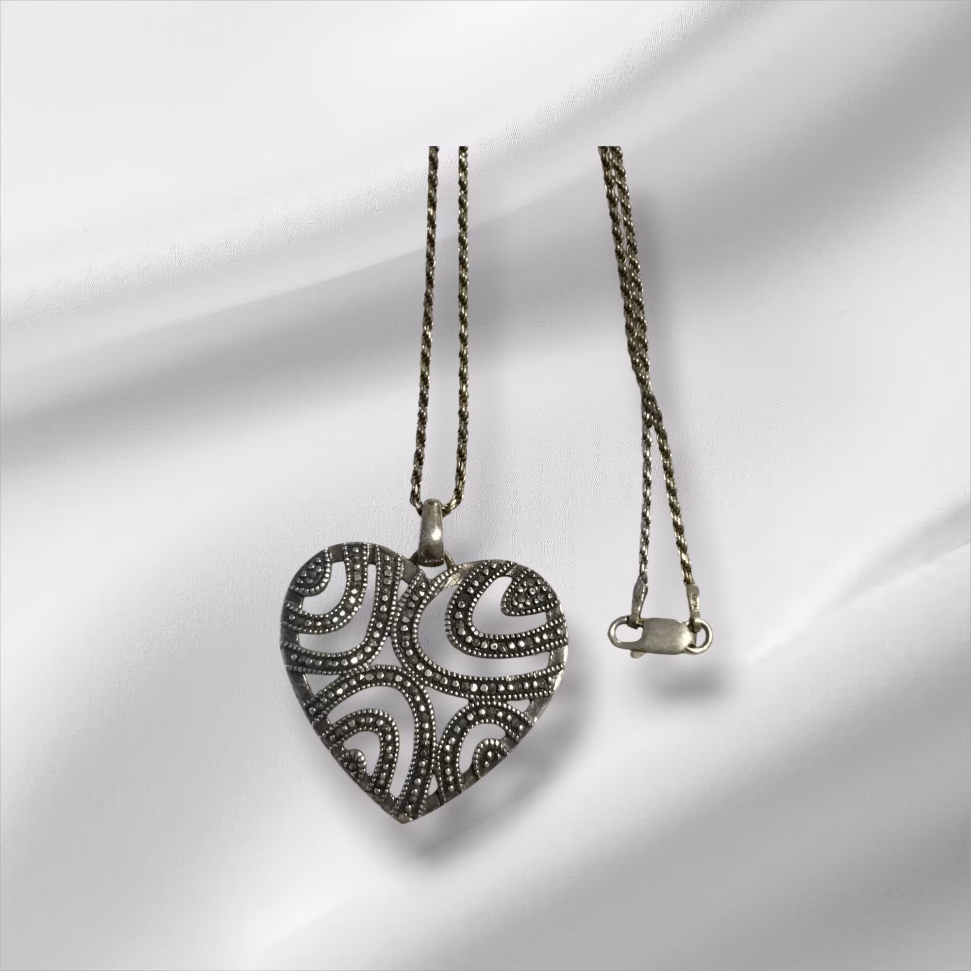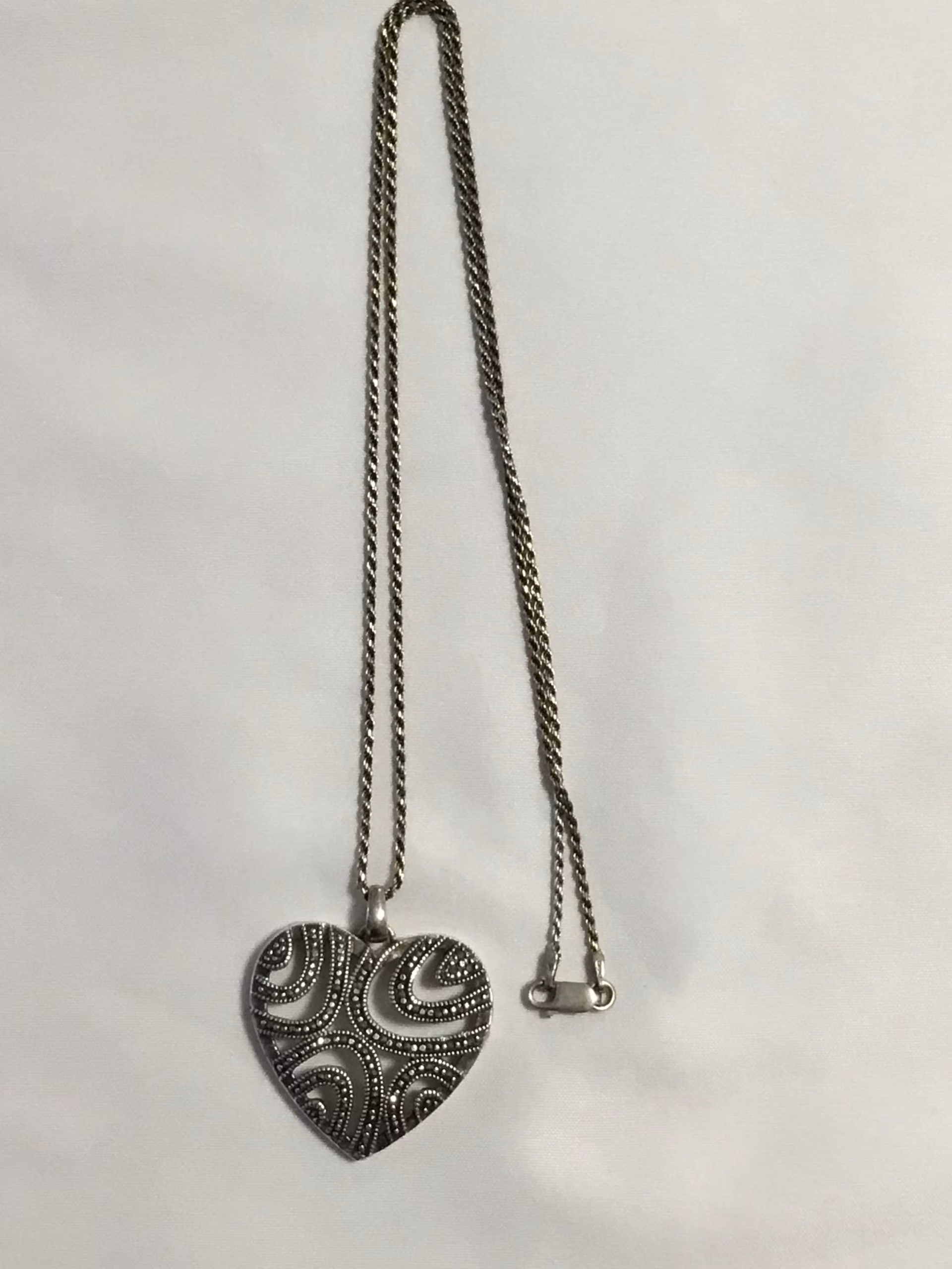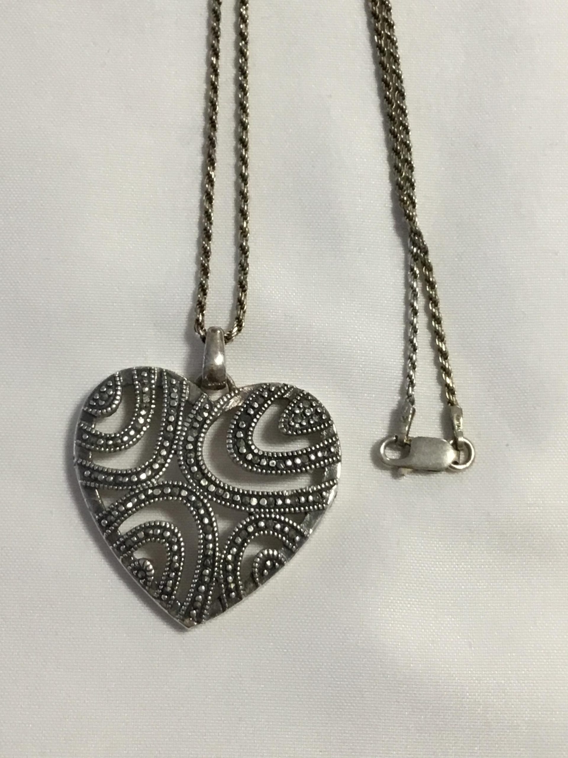 Sterling Silver Rope Chain Necklace w/Lg Heart Pendant 20″. Heart measures 1″, both necklace and chain are marked 925. Please view the images for condition and details and grade by your own grading standards.