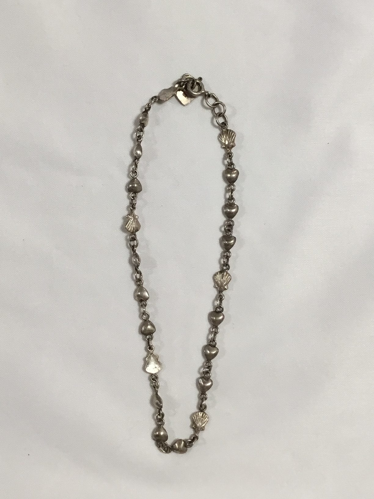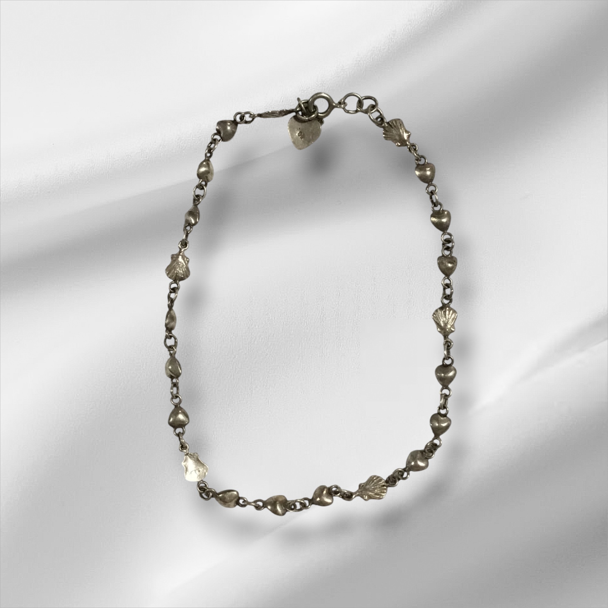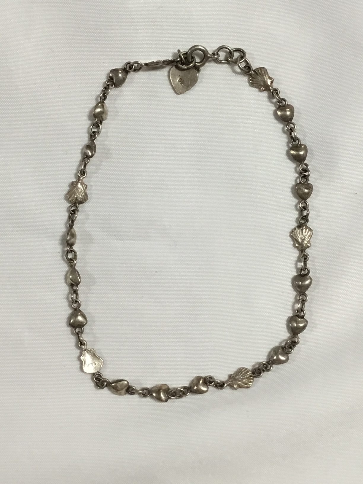 Sterling Silver Shell & Heart Bracelet 8″. Marked 925. Please view the images for condition and details and grade by your own grading standards.