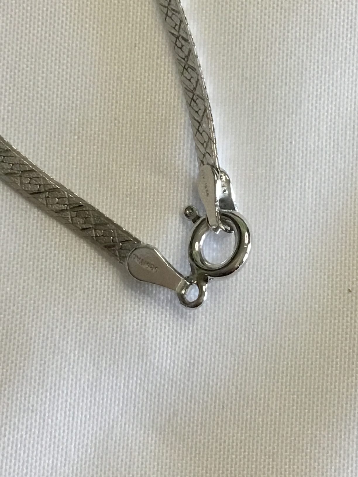 Stunning Sterling Silver Herringbone Necklace 16″. Marked 925 Italy. The necklace is in “as found” condition and not cleaned by us, leaving the choice of cleaning or not up to its new owner. Please view images for condition and details and grade by your own grading standards. Great gift item. C